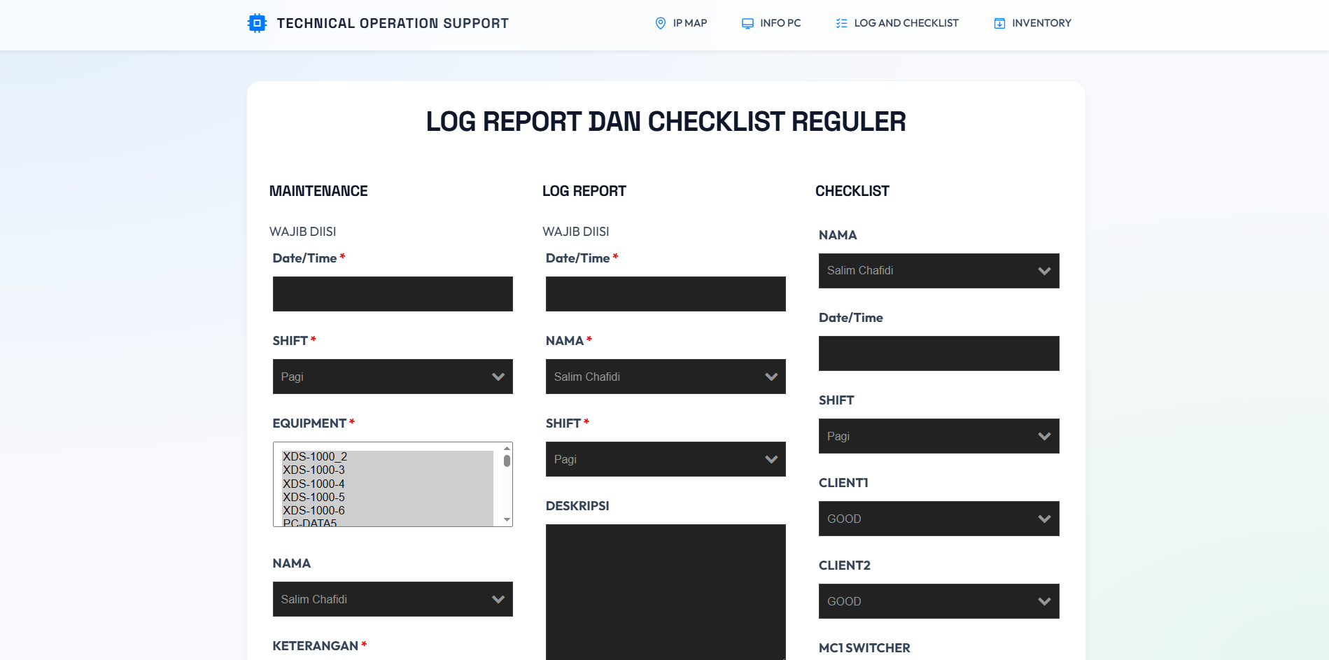 A web-based internal system for managing technical operations including logs, inventory, PC information, and network mapping.
