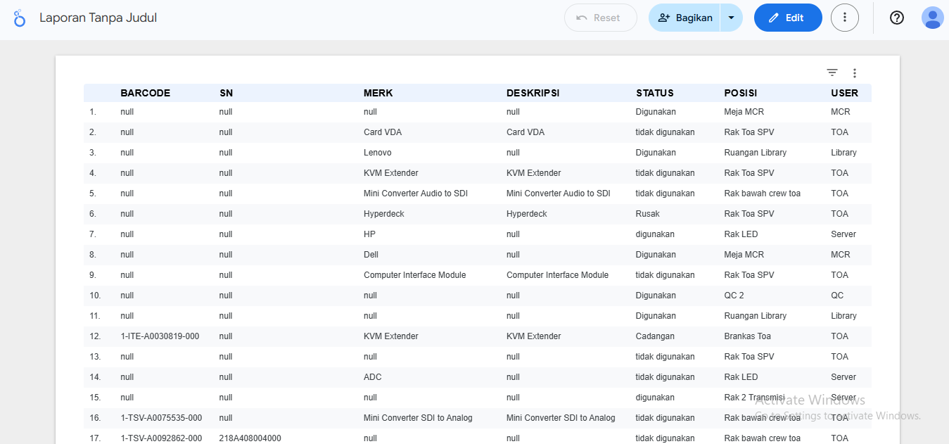 Displays a structured list of assets including barcode, serial number, location, status, and user. Helps track equipment usage and condition in real-time.